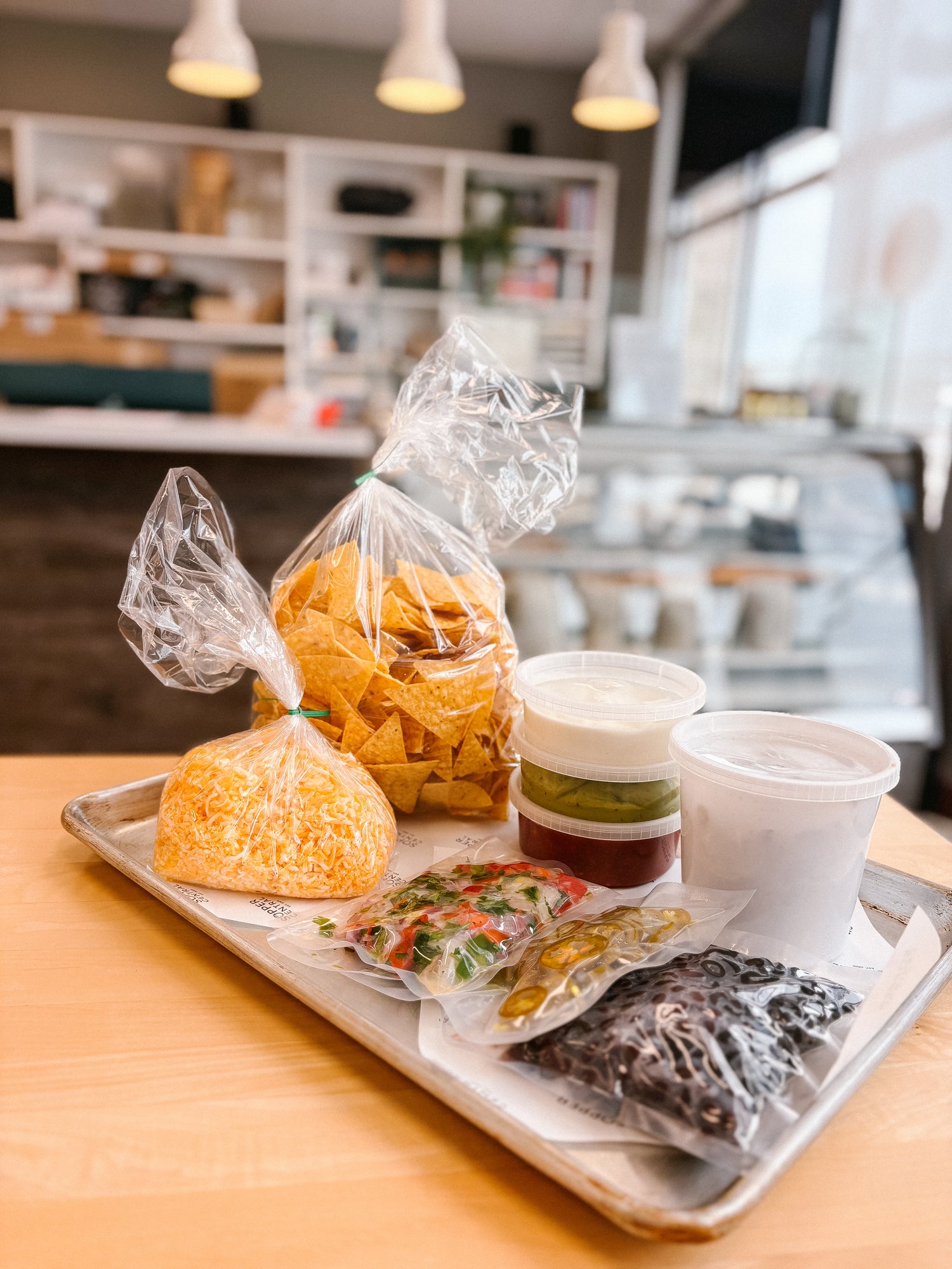 All ingredients are packaged separately so you can customize your tray of nachos any way! Makes 1 large baking sheet of loaded nachos. Serves 6-8.