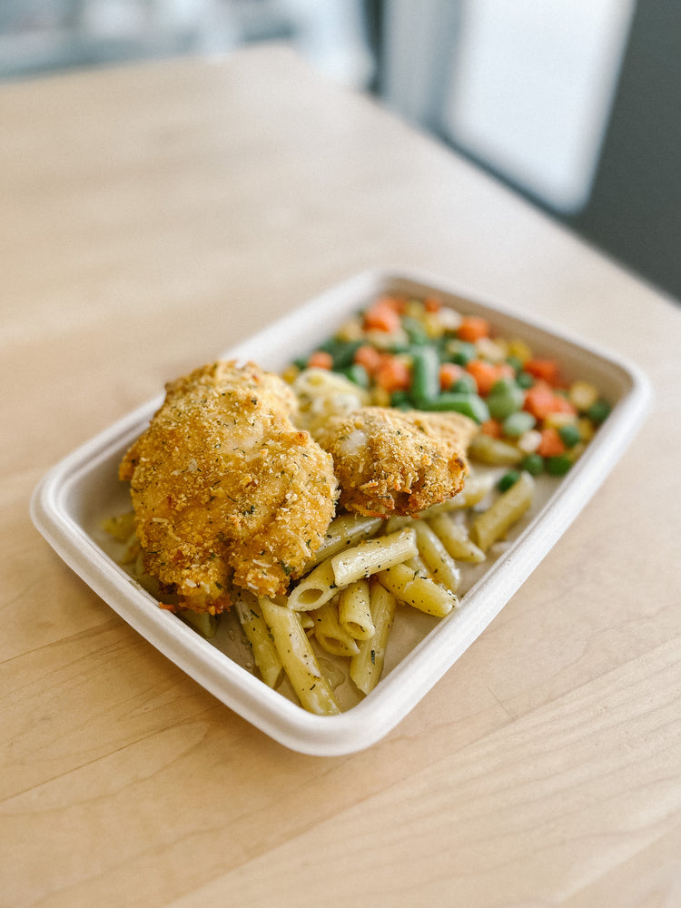 Chicken breast pieces are coated in corn flakes, parmesan cheese, and ranch seasoning, then baked to create a crispy and tasty entrée! Served overtop of herb and parmesan penne and side vegetable.