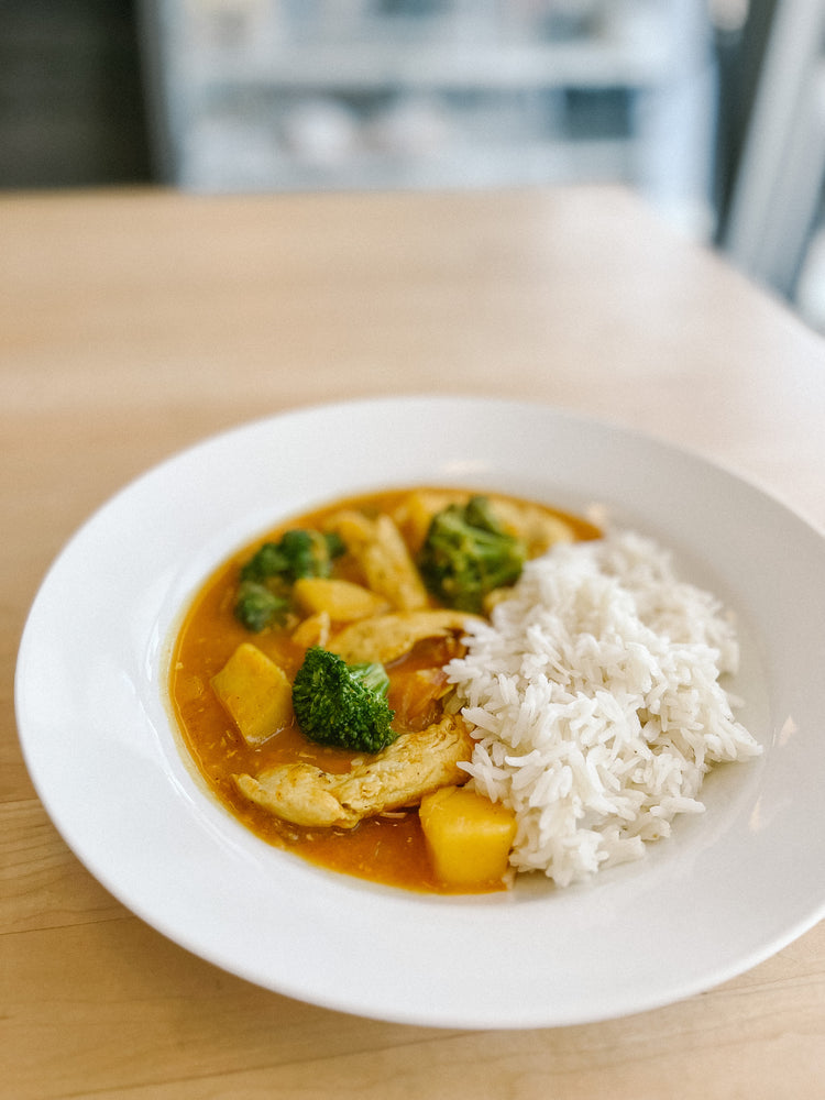 We love the tangy sweetness of this curry! Chicken breast strips are stir fried with ginger, broccoli, red onion and mango then simmered in a homemade sweet curry sauce. Includes basmati rice for serving.
