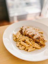 Seasoned buffalo chicken breasts are seared and baked, then served alongside a lusciously coated, creamy buttermilk herb penne pasta.