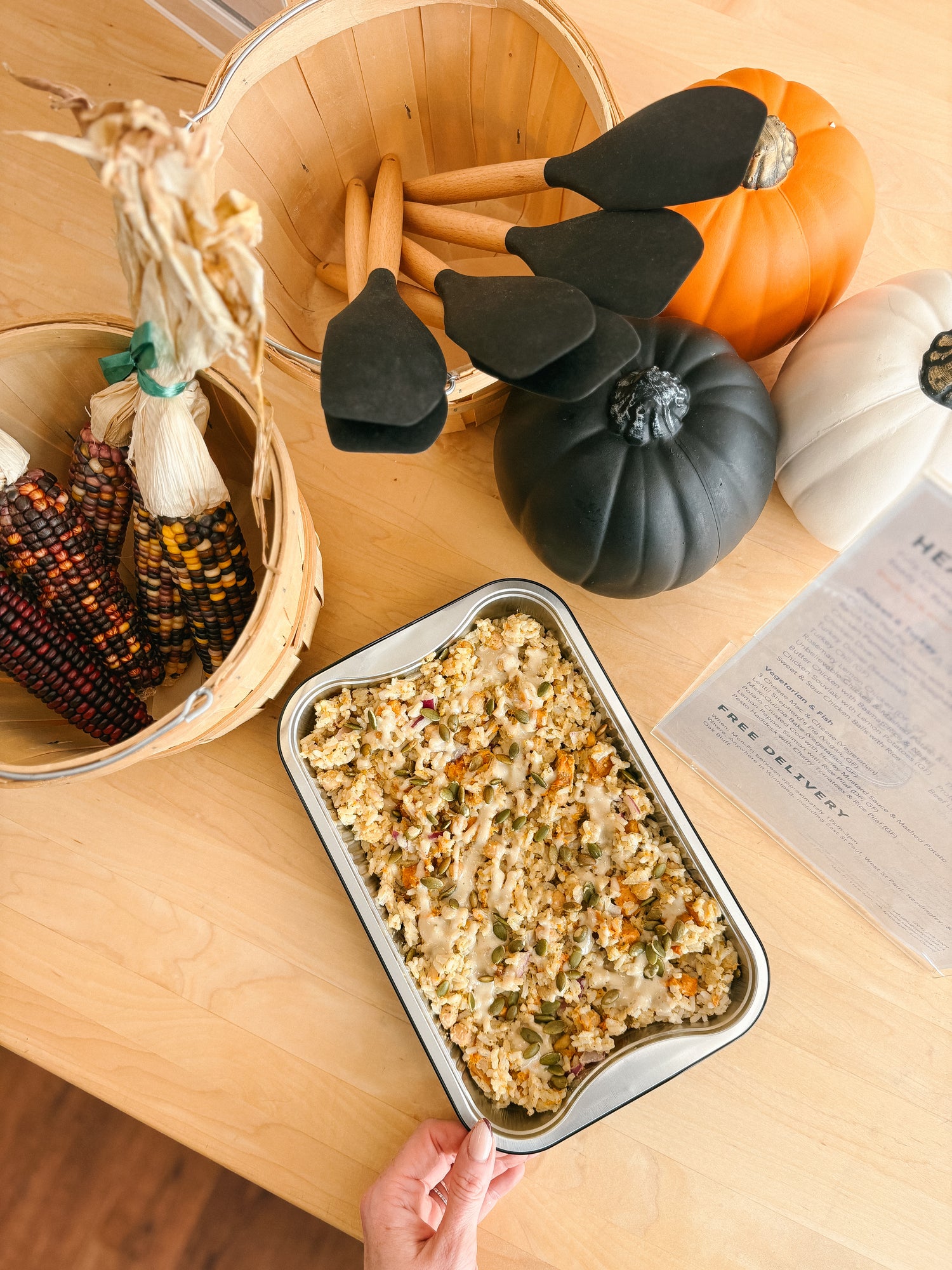 A delicious and nourishing bake loaded with roasted sweet potatoes, chickpeas, and rice. Tossed with a creamy spiced tahini sauce and topped with pumpkin seeds for a tasty crunch! Perfect as a main meal or a side dish.